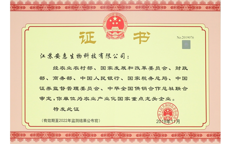 • 安惠公司入選農業產業化國家重點龍頭企業